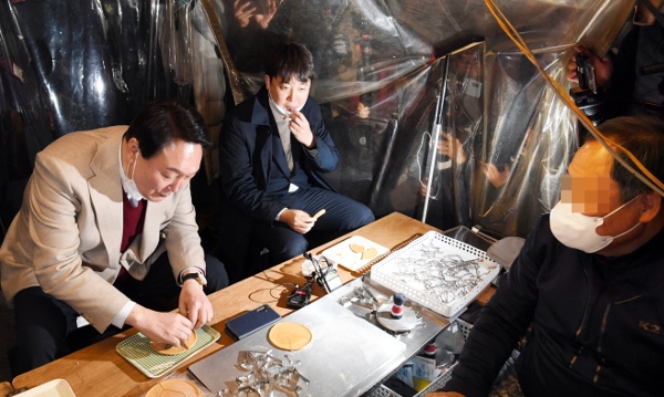 윤석열(왼쪽) 국민의힘 대선 후보와 이준석 국민의힘 대표가 서울 종로구 대학로에서 거리인사 중 한 노점에서 넷플릭스 드라마 ‘오징어게임’에 나온 달고나 뽑기를 하고 있다. 윤 후보와 이 대표 모두 달고나 뽑기에는 실패했다. 앞서 윤 후보는 청년문화예술인들과의 간담회에 참석해 “문화예술인들이 갑질 횡포를 당하지 않게 세심하게 (정책을) 준비하겠다”고 말했다. 국회사진기자단