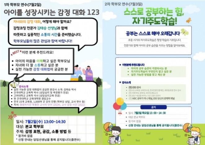 학부모연수는 내달 2∼3일 자녀의 학습 및 성장 과정을 이해하고 효과적으로 지원할 수 있도록 돕는 강의가 진행된다. 첫날에는 김태승 교사(자녀교육법-아이를 성장시키는 감정대화 123), 3일에는 EBS강사인 강용철 교사(스스로 공부하는 힘, 자기주도학습)가 강의한다.