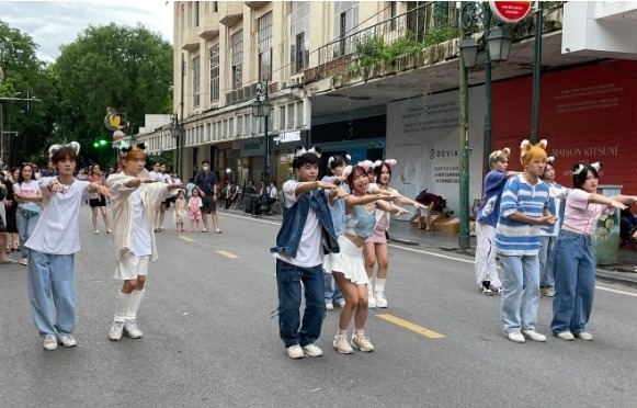 (사진=VnExpress/Tam Anh) 하노이 호금보행자거리에서 열린 문화예술행사에 현지 젊은이들이 참여해 동작을 따라하고 있다.