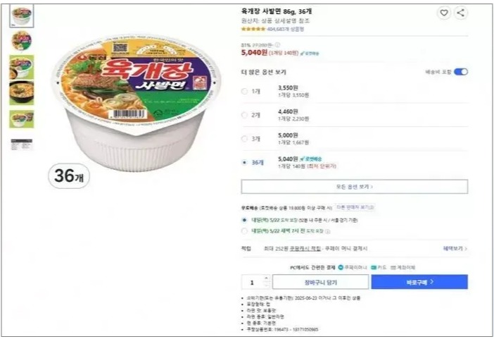 22일 유통업계에 따르면 전날 쿠팡에서 가격 오류가 발생했다. 정상가로는 3개에 5000원에 판매되는 육개장 사발면 36개가 단돈 5040원이라는 가격에 올라왔다. 개당 약 140원 수준인 셈.