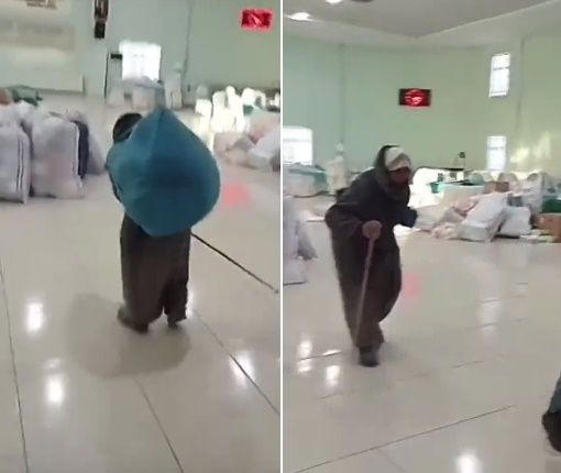한 튀르키예 할머니가 지팡이를 짚은 채 지원센터에 구호물품을 내려놓고 가고 있다. /트위터 © 제공: 조선일보