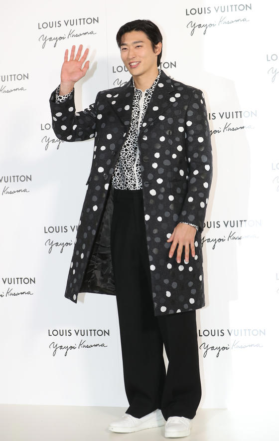 축구 국가대표 선수 조규성이 6일 서울 강남구 루이비통 메종 서울에서 열린 루이비통과 쿠사마 야요이와의 협업 기념행사에서 포즈를 취하고 있다.