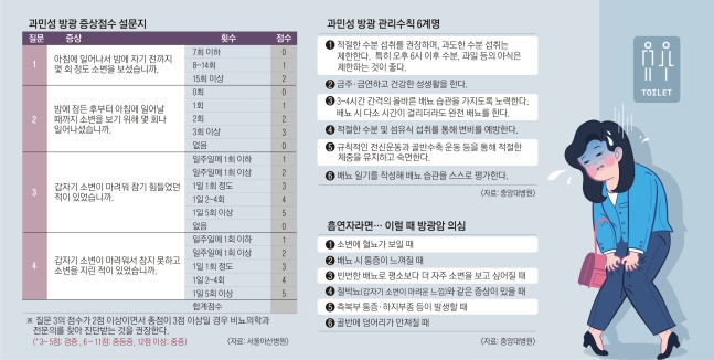 하지수 연세대 강남세브란스병원 비뇨의학과 교수는 2일 “과민성 방광 증세를 지닌 분들의 주된 증상은 소변 문제로 나타난다”고 말했다. 소변을 오래 참지 못하다 보니 심하면 소변을 1~2시간에 한 번꼴로 자주 보고, 수면 중 소변을 보는 야간뇨가 동반되는 경우가 많다는 것이다.