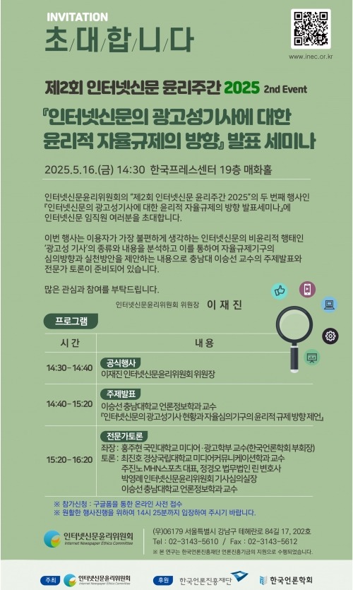 인터넷신문 자율규제기구인 인터넷신문윤리위원회(위원장 이재진, 이하 인신윤위)가 ‘인터넷신문의 광고성기사에 대한 윤리적 자율규제의 방향’ 발표 세미나를 오는 16일 프레스센터에서 개최한다.