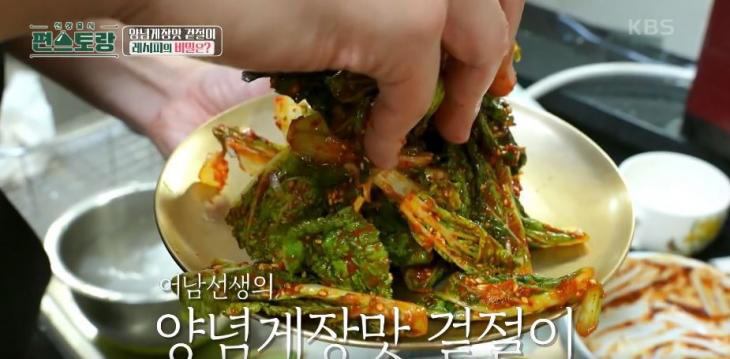 갓 지은 밥맛을 확인한 그는 감탄을 이어갔다. 그러면서 "국수를 먹으러 갔다가 그 집 겉절이를 먹었는데 양념게장 맛이 나더라"라며 연구를 했다고 밝히며 해당 레시피를 공개했다.