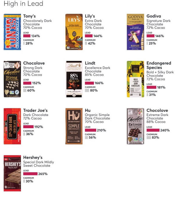 허쉬, 테오, 트레이더 조 등 유명 해외브랜드 다크 초콜릿에서 납과 카드뮴 등 중금속이 발견됐다는 연구 결과가 나왔다. 미국 소비자 전문 매체 컨슈머리포트가 28개 브랜드의 다크 초콜릿을 대상으로 중금속의 양을 측정해 나온 결과다. 심지어 28개 중 23개 브랜드의 다크 초콜릿을 하루에 약 30g만 먹어도 캘리포니아의 일일최대섭취한계량(MADL)을 초과하는 양의 중금속에 노출될 수 있다고 한다.