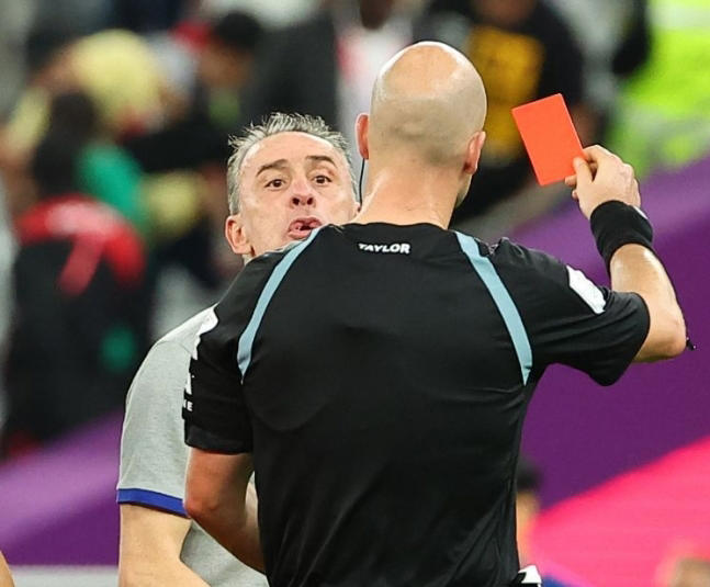 지난 28일 오후(현지시간) 카타르 알라이얀의 에듀케이션 시티 스타디움에서 열린 2022 카타르 월드컵 조별리그 H조 2차전 대한민국과 가나의 경기에서 파울루 벤투 감독이 경기 후 심판 판정에 항의하다 레드카드를 받는 모습. 연합뉴스 / © 제공: 세계일보