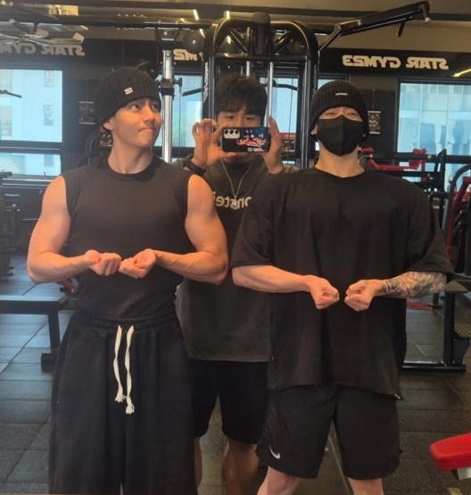 3일 보디빌더 최한진은 자신의 사회관계망서비스(SNS)에 "와이프가 매일 보던 영상 속 두 청년이 내 눈앞에 있다니"라며 뷔, 정국과 함께 찍은 사진을 올렸다.