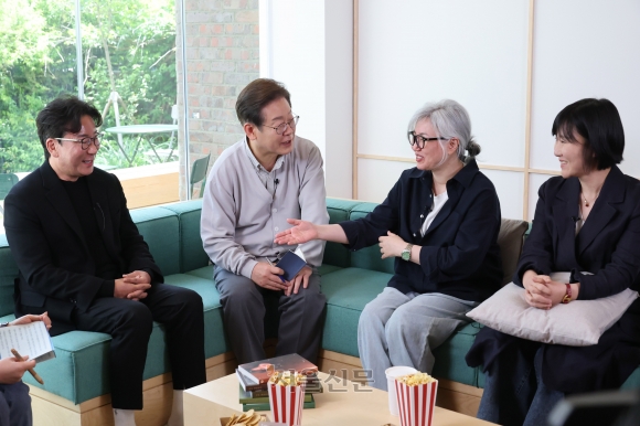 이재명 더불어민주당 대선 후보가 7일 전북 전주시 한옥마을 내 한 카페에서 ‘영화와 드라마, 정치가 그리는 미래의 스크린’이라는 주제로 윤제균 영화감독,