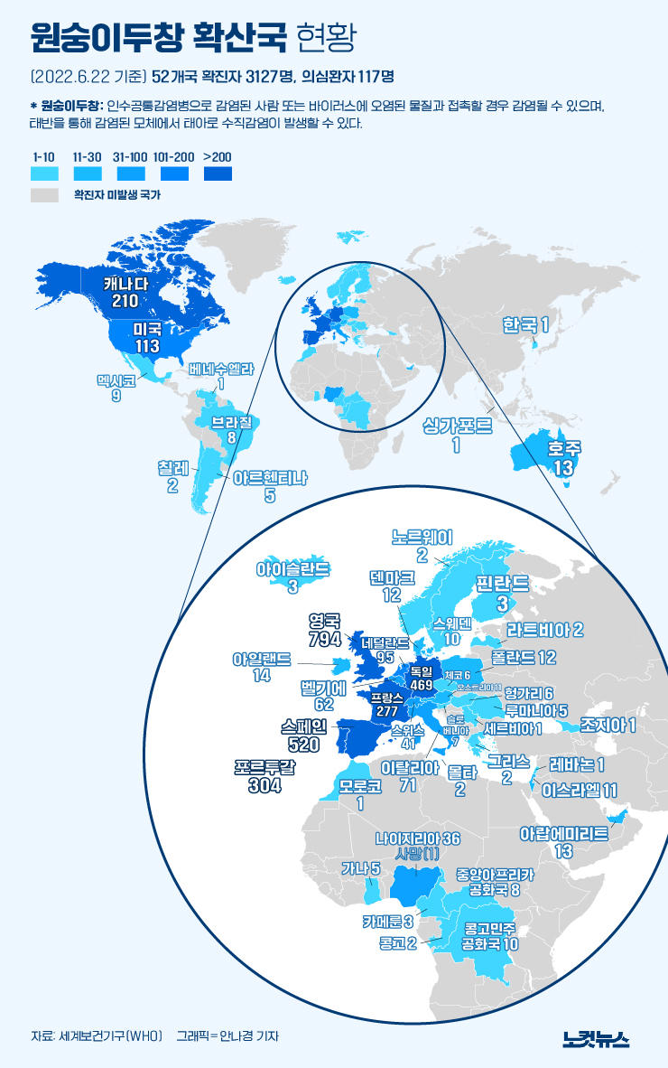 원숭이두창 확진자 발생국 현황 베트남조아 0 504 2022.06.24 01:28 원숭이두창 확진자는 22일 기준 52개국 3127여 명으로 집계됐다. 대다수는 유럽 지역에서 발병했다.