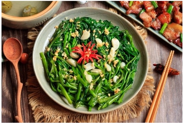 (사진=VnExpress/Bui Thuy)베트남의 볶음 요리중 하나인 라우므엉싸오떠이(공심채마늘볶음)가 세계 100대