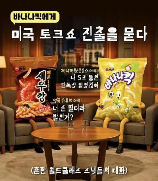 이에 농심은 19일 공식 SNS에 자사 제품인 바나나킥과 새우깡을 의인화한 토크쇼 장면을 게시물로 올리며 화제를 이어갔다.
