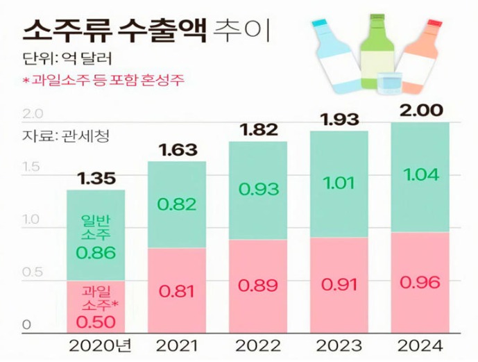 한국 소주의 글로벌 진출이 새로운 기록을 세웠다. 세계적인 ‘순한 술’ 열풍과 K-문화 확산에 힘입어 한국의 소주류 수출이 사상 처음으로 연간 2억 달러(한화 약 2910억원)를 돌파한 것이다.
