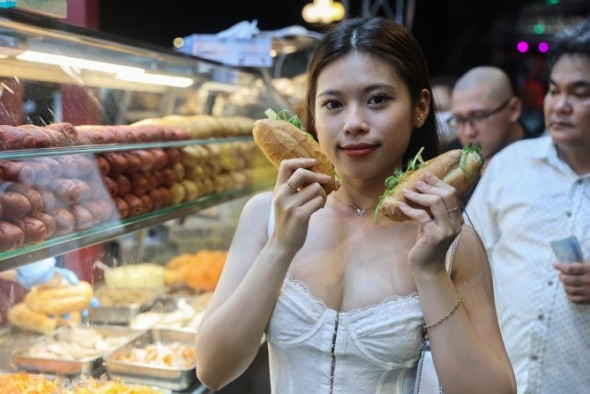 (사진=VnExpress/Quynh Tran) 지난해 5월 제2회 호치민시 반미 축제에서 방문객이 반미를 들어보이고 있다.