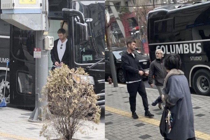 버스에 부착된 ‘촬영’이라는 표지판과 거리의 간판의 모습으로 비춰 한국 내 머물고 있는 것으로 보인다. 헴스워스가 있었던 곳은 신촌이었다는 목격담도 이어졌다.