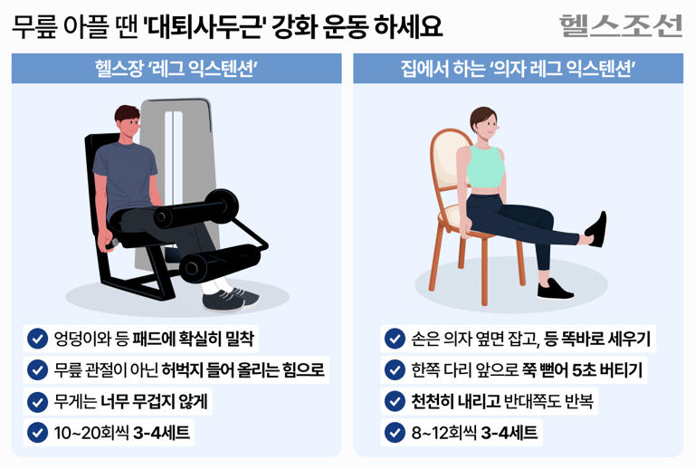 뉴본정형외과 임창무 원장은 "연골에 가해지는 압력을 줄이려면 무릎 관절 주변 근육을 강화해야 한다"며 "특히 허벅지 앞쪽을 차지하는 '대퇴사두근'을 강화하는 게 좋다"고 말했다. 이 근육은 슬개골 위쪽에 있어 무릎을 펴거나 움직일 때 핵심적인 역할을 한다. 대퇴사두근이 튼튼하면 슬개골 마찰을 줄이고, 무릎이 뒤틀려도 인대나 연골판이 쉽게 다치지 않는다.