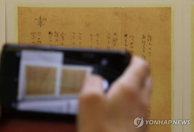 일본 도쿄 릿쿄대에서 지난 23일 열린 일제강점기 저항시인 윤동주 80주기 추도 행사를 맞아 윤동주가 릿쿄대 재학 시절 썼던 시가 전시돼 있다. 연합뉴스