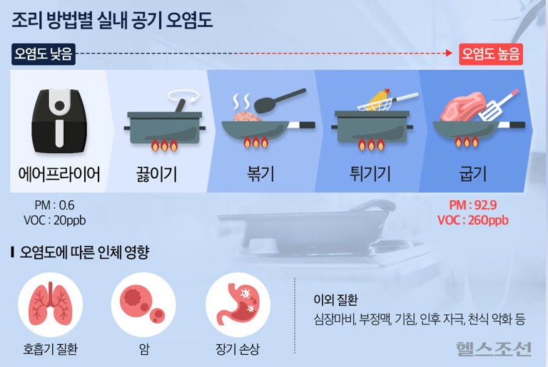 튀기기 vs 끓이기 vs 볶기… ‘공기 질’에 가장 안 좋은 건? / 최지우 기자 ©헬스조선