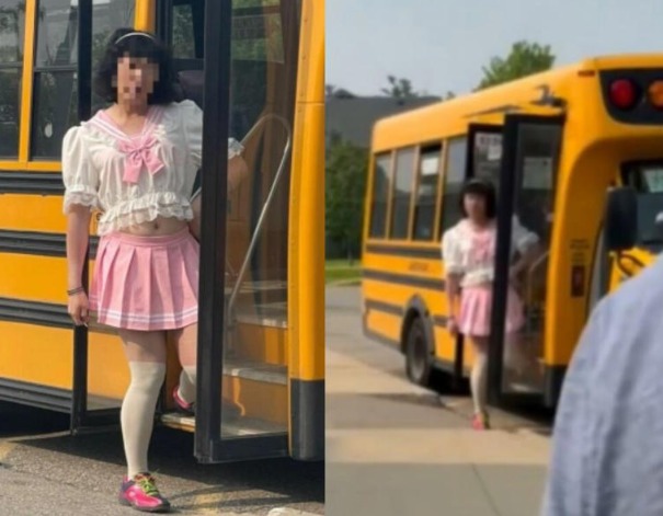 캐나다의 한 초등학교 버스 운전사가 여학생 교복 스타일의 의상을 입고 아이들을 등하교시키는 모습이 포착됐다. 논란이 일자 해당 운전자는 학부모 항의에 해고된 것으로 전해졌다.