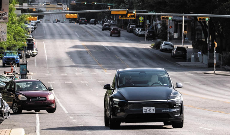 운전자 없이 안전거리 확보도 ‘척척’ 22일(현지 시각) 미 텍사스주 오스틴의 한 도로에서 테슬라의 로보(무인) 택시가 승객을 태우고 운행하고 있다.