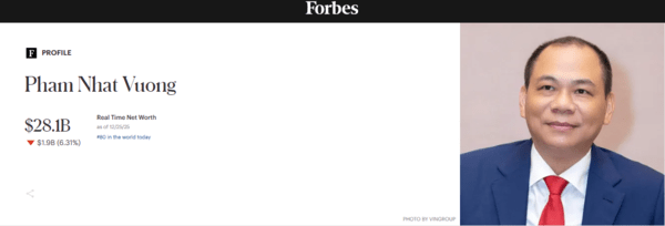 미국 경제 전문지 포브스의 실시간 세계 억만장자 순위에 따르면, 25일 베트남증시 마감 후 브엉 회장의 순자산은 전일 대비 19억 달러 줄어든 281억 달러를 기록했다. 브엉 회장은 이날 포브스 세계 부호 중 순자산이 가장 크게 감소한 인물로, 지난 23일 71위였던 세계 부호 순위는 80위로 주저 앉았다.