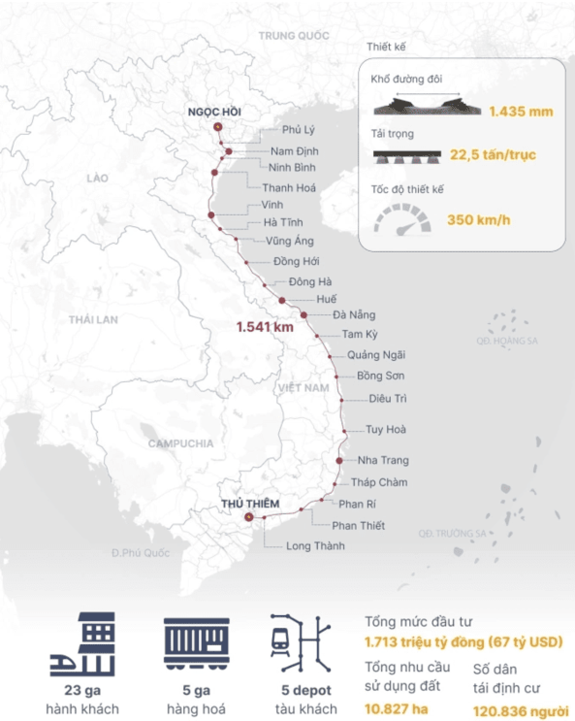 베트남 주요 전략 인프라 사업 중 하나인 북남고속철도는 하노이 응옥호이역(Ngoc Hoi)부터 호치민 투티엠역(Thu Thiem)까지 20개 성·시를 통과하는 길이 1541km, 설계속도 350km/h(1435mm 표준궤간)의 여객중심 복선 철도로, 총사업비 1700조 동(약 650억 달러) 이상이 투입되는 베트남 역사상 최대 규모의 인프라 투자 사업이다.